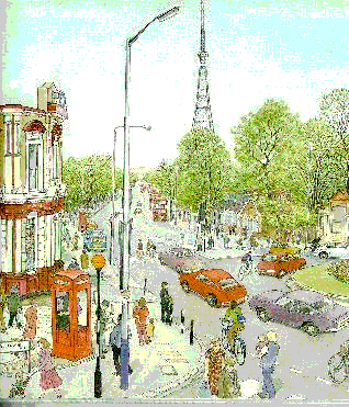 The White Swan, cabmen's kiosk, Crystal Palace Parade. This Prospect is what is left of the splended approach to the Palace gates which were along the right side of Crystal Palace Parade stretching into the distance. Buses still park where they can be seen in the centre of the picture. The trees, centre-right have now been felled to make way for a new bus parking/turn-around area currently under construction. The "White Swan", minus its top floor, was a casualty of wartime bombs. The pub is the second on this site - the original was a coaching inn with large tea-gardens before the Palace was erected here. Earlier still there was a smithy on the site. |