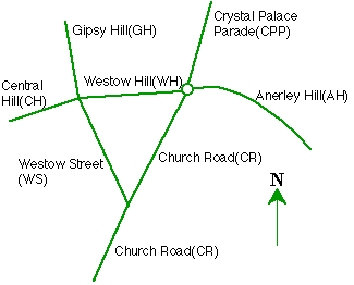 Triangle main approaches: Central Hill, Gipsy Hill, Crystal Palace Parade, Anerley Hill, Church Road (south)